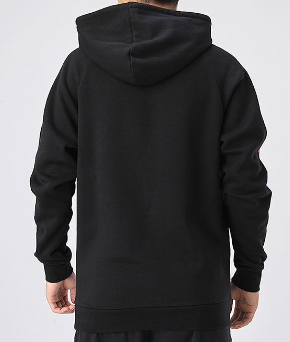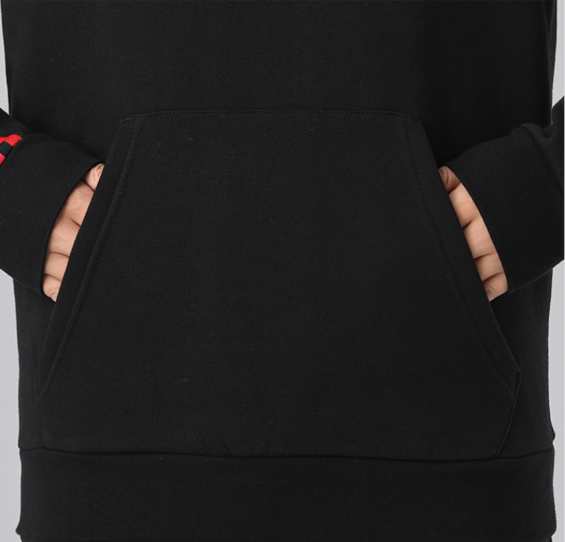 Bluza lekko ocieplana od wewnątrz. Posiada charakterystyczne 3 paski na całej długości rękawów oraz kieszeń typu kangur. Dół oraz mankiety rękawów zakończone ściągaczem dla lepszego dopasowania. Duży kaptur ze ściągaczem zapewni ochronę przed wiatrem i niewielkim deszczem. Kieszeń typu kangur pozwoli na bezpieczne przechowywanie drobnych przedmiotów.