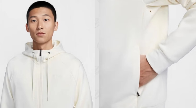 Bluza Nike AS z dwukierunkowym zamkiem z kapturem. Utrzymany w beżowej kolorystyce model wykonano z miękkiego polaru o gładkim wykończeniu. Posiada lekko elastyczny dół, obszyte tasiemką mankiety oraz kołnierz osłaniający podbródek. Po bokach nie mogło zabraknąć zasuwanych kieszeni. Przód ozdobiono kultowym logo Nike.