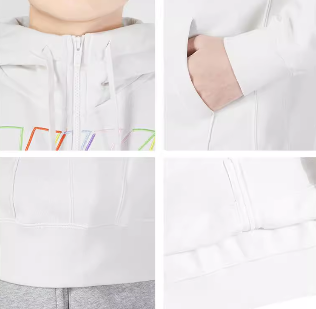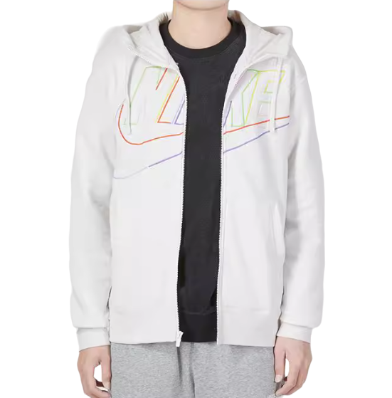 Kaptur ze ściągaczem daje dodatkową osłonę i indywidualne dopasowanie. Biała bluza posiada kolorowe logo Nike na froncie oraz funkcjonalny zamek na całej długości.