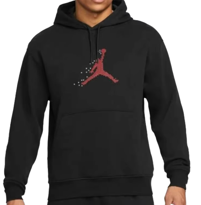 Na środku bluzy znajdziemy logo Jumpmana, a na plecach napis Jordan, wszystko utrzymane w oldschoolowym pikselowym charakterze.