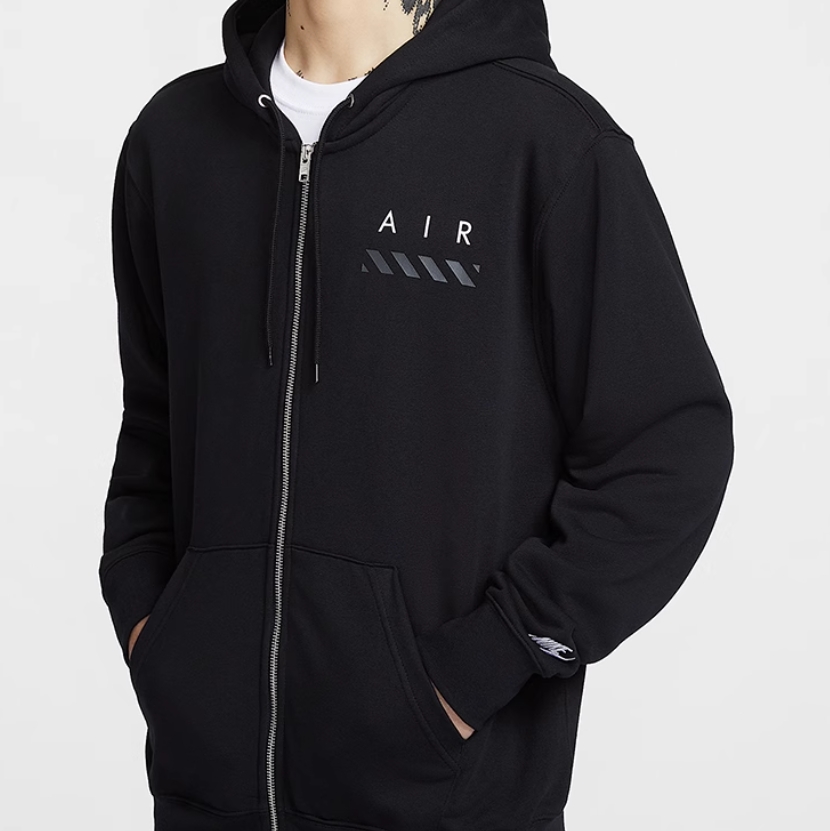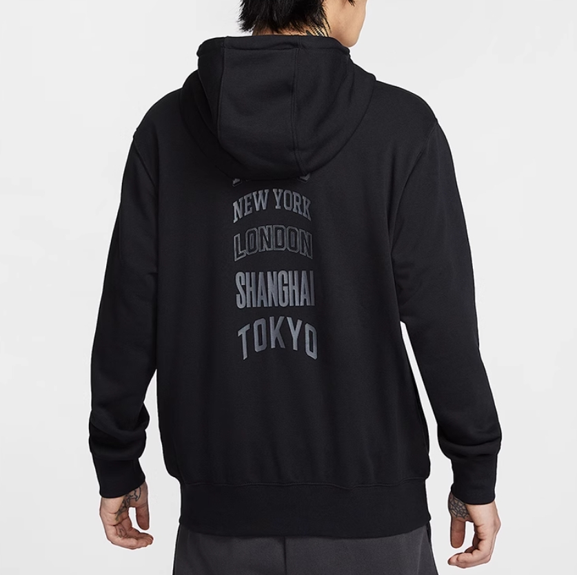 Bluza Nike Sportswear Club zapinana na całej długości z kapturem. Utrzymany w czarnej kolorystyce model wykonano z miękkiego materiału o gładkim wykończeniu. Posiada lekko elastyczny dół, obszyte tasiemką mankiety oraz kołnierz osłaniający podbródek. Po bokach nie mogło zabraknąć pojemnych kieszeni. Przód ozdobiono kultowym logo Nike, zaś plecy nazwami największych miast na świecie.